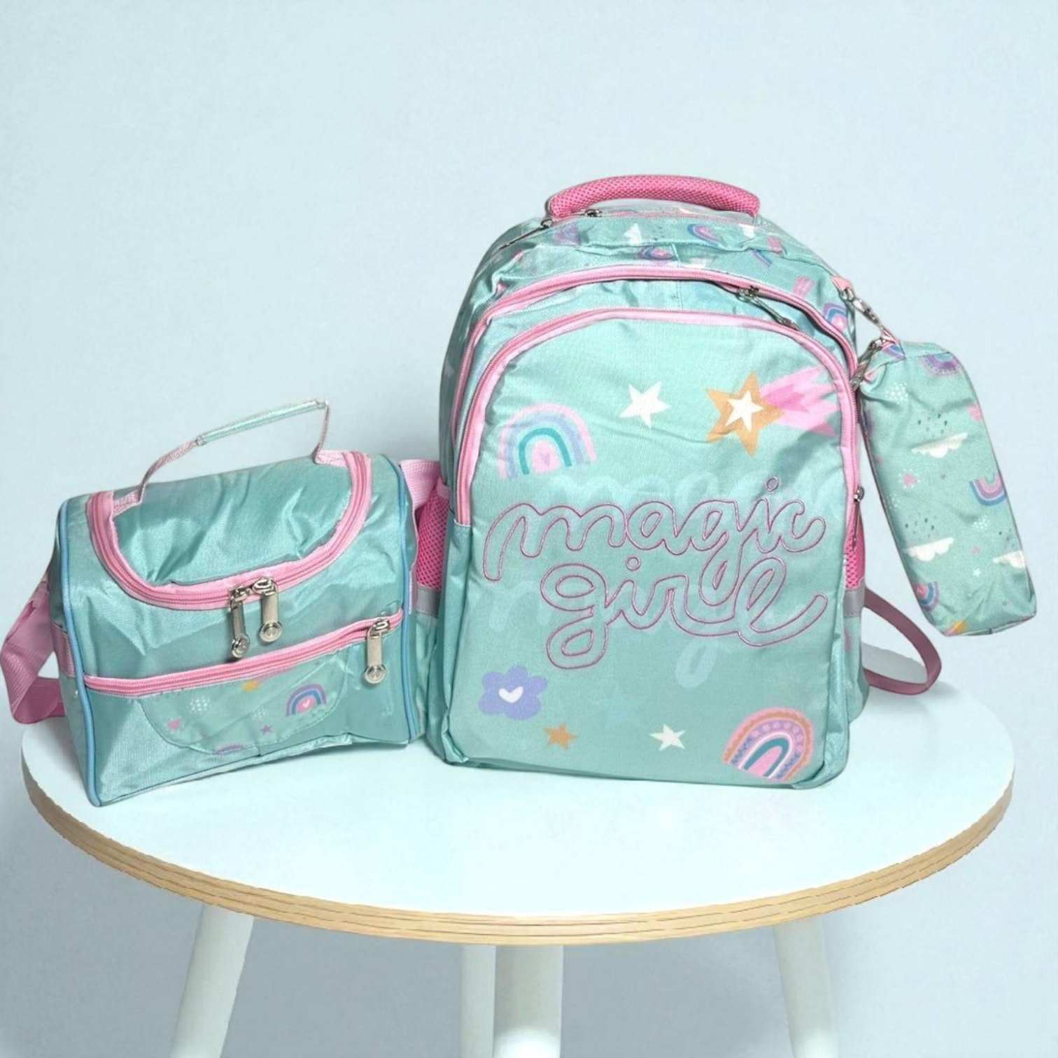 Upgrade your child's school essentials with the Magic Girl 3 Pc School Bag. This set includes a lunch bag, pencil case, and a 17-inch school bag suitable for class 2-6. Available at Bachun Ki Duniya online store in Pakistan, made with durable parachute material for long-lasting use. Perfect for the young fashion-forward student.