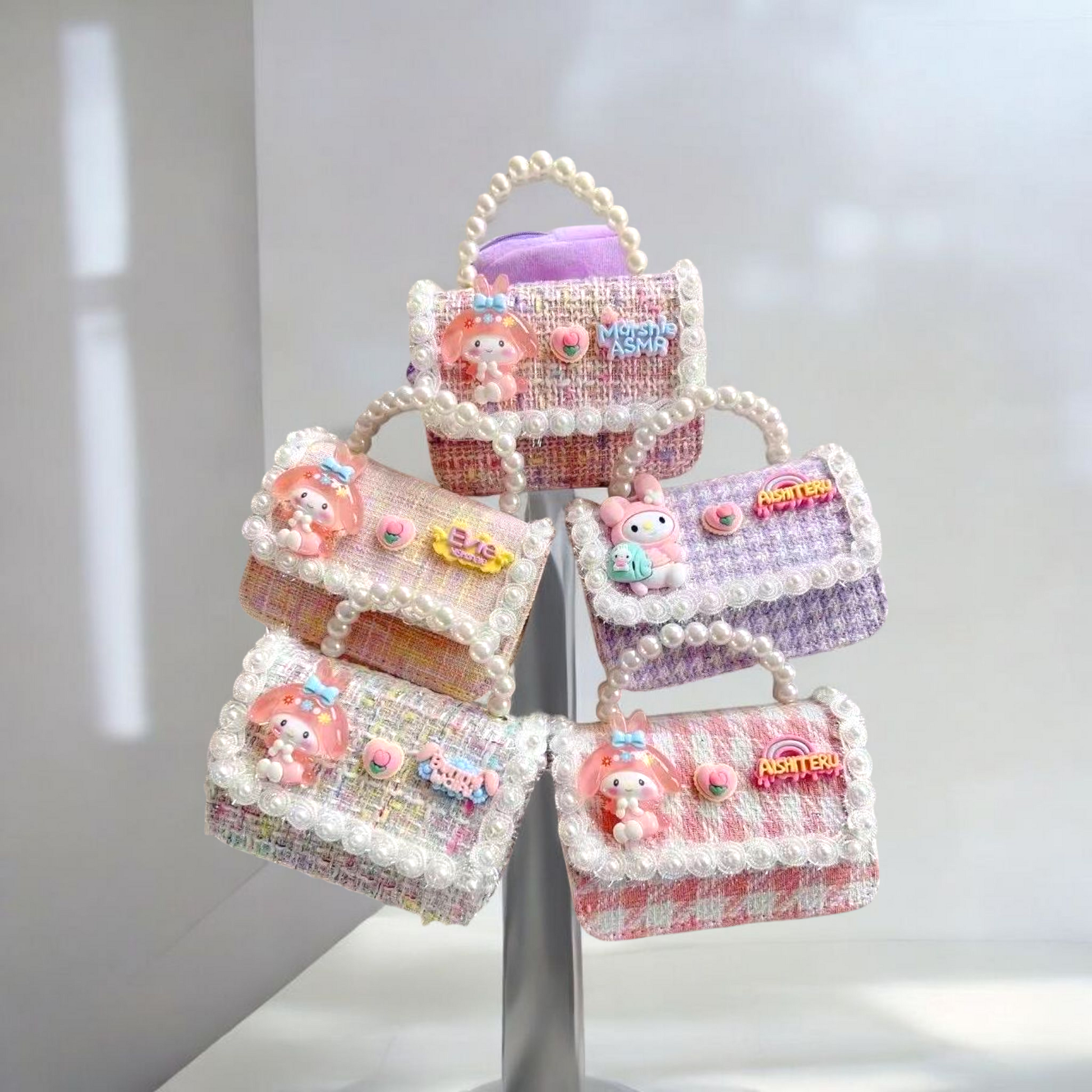 Add a touch of charm to your accessories with these beautifully handcrafted mini bags! Made with soft pastel tweed fabric and adorned with pearl handles, lace trim, and adorable character embellishments, these bags are perfect for carrying small essentials in style.