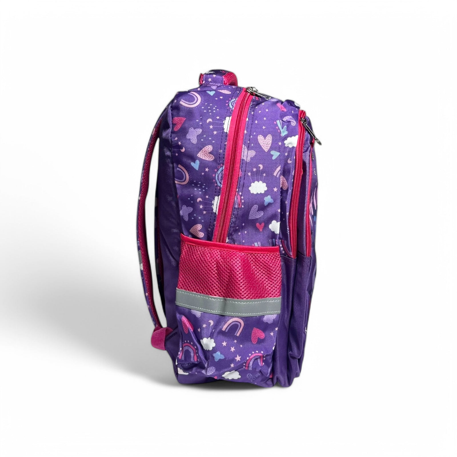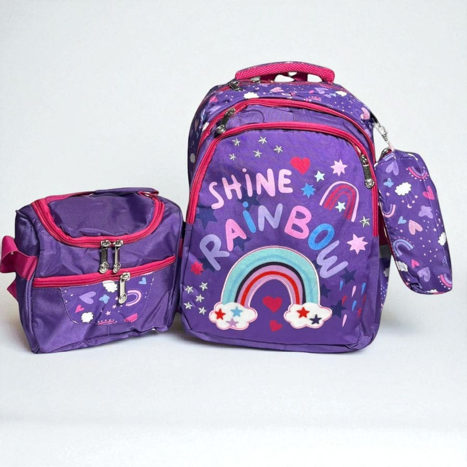 Designed for ultimate convenience, the Rainbow School Bag includes a lunch bag and pencil case along with a spacious 17-inch school bag. Perfect for class 2 to 6, this essential school accessory can be found at Bachun Ki Duniya online store in Pakistan. Made with durable parachute material for long-lasting use.